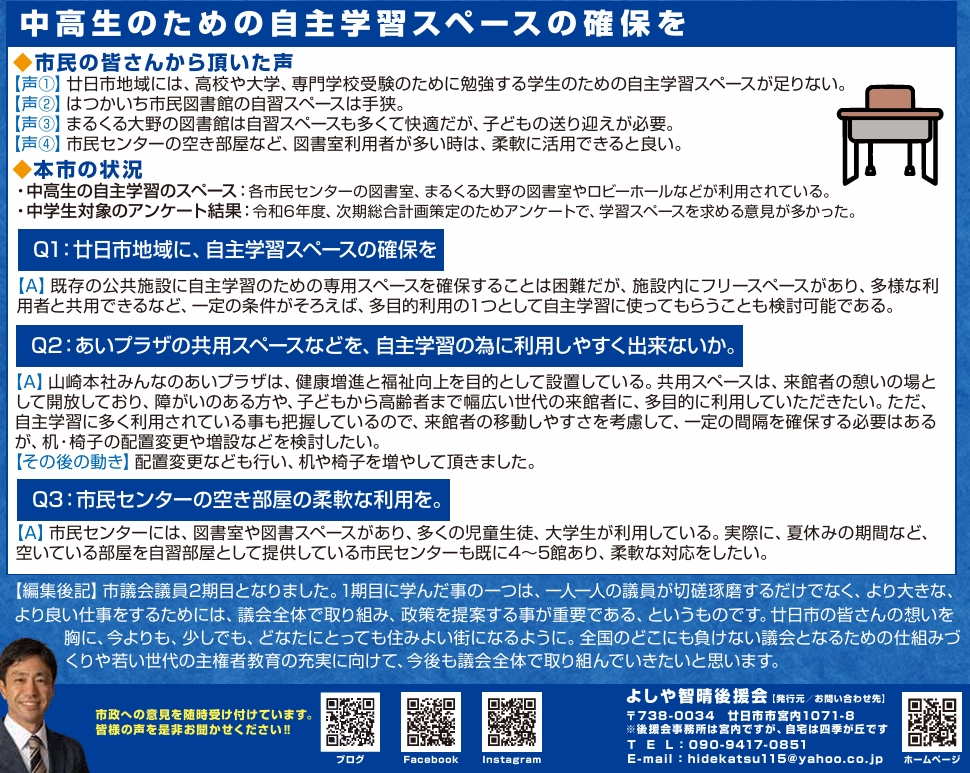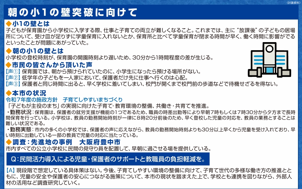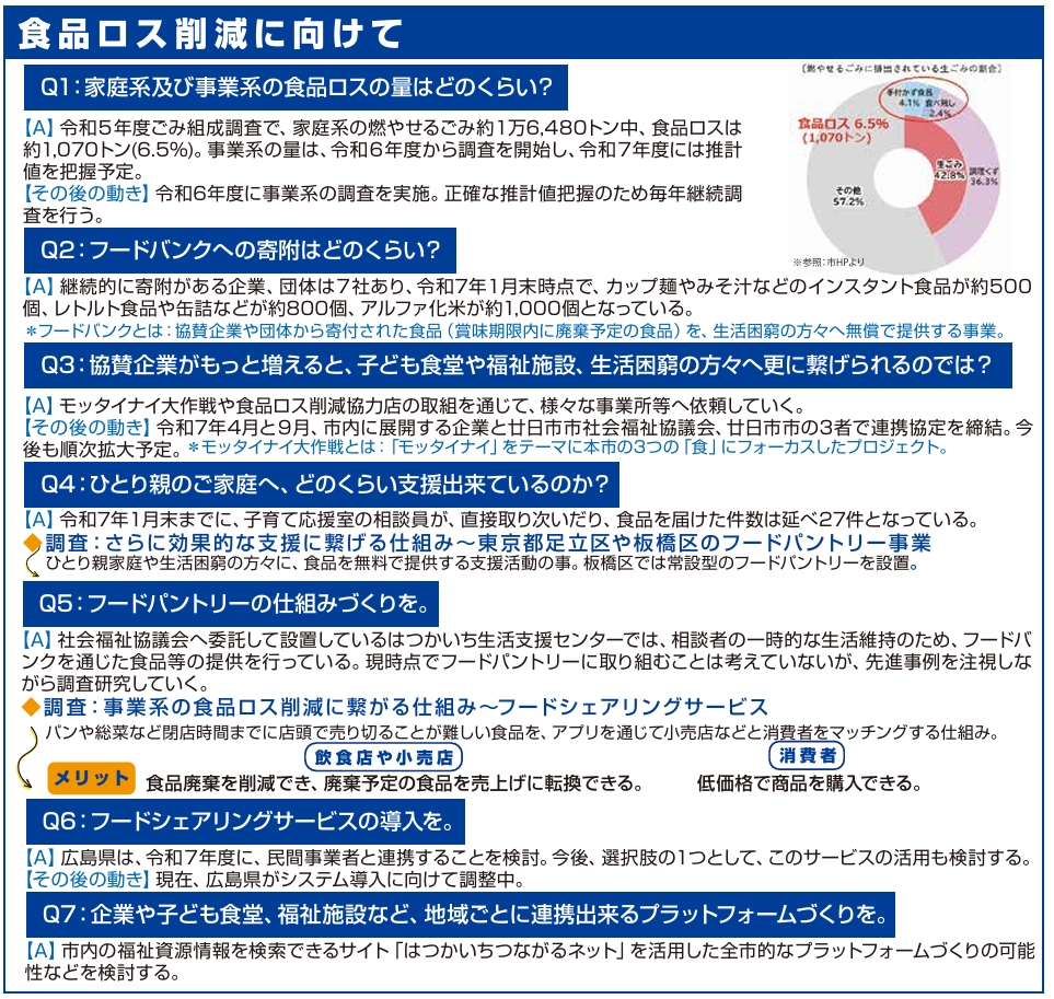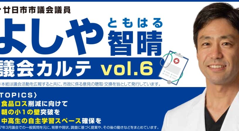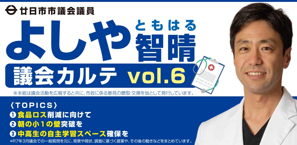 議会カルテ Vol.6 TOPICS① 食品ロス削減にむけて TOPICS② 朝の小1の壁突破を TOPICS③ 中高生の自主学習スペース確保を *R7年3月議会での一般質問を元に、背景や現状、調査に基づく提案や、その後の動きなどをまとめています。 Tweet Share 議会カルテ Vol.5前の記事